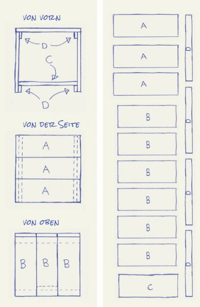 Anmerkung zu den Maßen: Teil C muss in der Länge gekürzt werden, wenn die verwendeten Bretter dicker sind als 21 mm, bei dünneren Brettern muss es entsprechend verlängert werden.