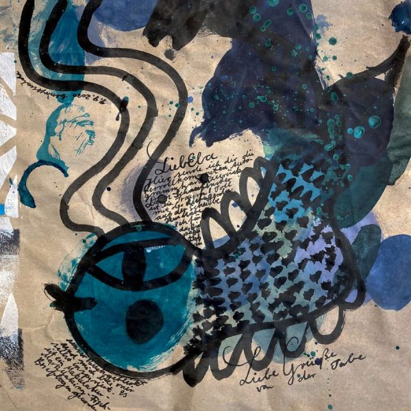 Tabea Heinicker: Letzte Woche Donnerstag habe ich die signierten Autogrammkarten für Michaela für die Post verpackt und dachte »Ich kann das jetzt nicht ohne Briefchen zu ihr schicken«. Weil ich es eilig hatte, habe ich auf mich selbst gehört. Im Buch beschreibe ich, wie man aus Makulatur Briefpapier macht. So habe ich aus dem Packpapier, das ich seit Monaten als Tischschoner verwende, ein Eck herausgeschnitten. Die vorhandenen Tuscheflecken habe ich in meinen Brief mit einbezogen und mit grobem Pinsel ein Fisch für Michaela gezeichnet. Das ist eine super Technik, um schnell was Schönes zu zaubern.