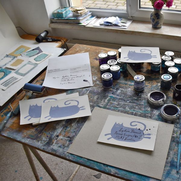 Tabea: Es gibt drei Aktionen im Jahr, die Frühlingspost, die Sommerpost und die Adventspost. Zurzeit läuft die Sommerpost, es geht um gedruckte Briefmarken. Michaela und ich formulieren das Thema, eine Drucktechnik, das Format und Material zu einem stimmigen Konzept und veröffentlichen es auf unserem Blog. Wir laden dazu ein, mitzumachen und stellen eine Woche lang ein Anmeldetool online. Wir bilden dann kleine Gruppen und schicken den Teilnehmerinnen (99 % sind dies kreative Frauen) eine Adressliste. So weiß jede genau, zu welchem Zeitpunkt sie den Teilnehmerinnen kunstvolle Post schicken darf.