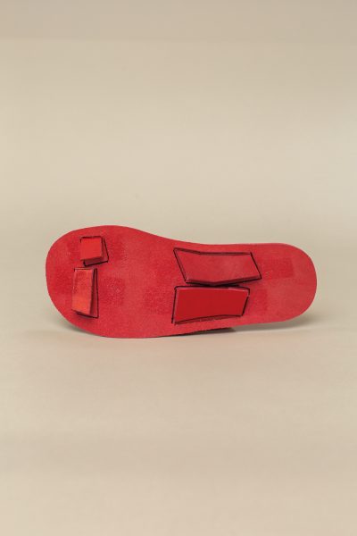 Ausschärfen: Die Laschen vorsichtig mit der Cutterklinge ausschärfen, damit sie beim Gehen nicht stören. Bei der Zehenschlaufe besonders behutsam vorgehen, damit nicht zu viel Material entfernt wird. Bei diesem Modell liegt der Schwerpunkt hierbei vor allem auf den hinteren Querkanten des Hauptriemens und den Bereichen am großen Zeh. Wichtig ist, die Laschen nur an den Kanten auszuschärfen, also nicht auf ganzer Fläche. Zwischendurch die Sandalen anprobieren und prüfen, ob noch etwas drückt. Danach die gesamte Brandsohlenunterseite mitsamt der Laschen flächig aufrauen, und zwar insbesondere im Randbereich, damit die Klebeverbindung auch hier lange hält.