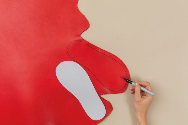 Vorzeichnen und ausschneiden: Zehenschlaufe und Hauptriemen auf dem Oberleder vorzeichnen (Lineal verwenden) und die Sohle auf dem dickerem Brandsohlleder. Die Sohlen gegengleich für beide Füße vorzeichnen. Die Oberteile knapp innerhalb der Linien ausschneiden, damit später keine Markierungen zu sehen sind. Die Brandsohlen dagegen direkt auf den vorgezeichneten Linien ausschneiden, damit sie nicht zu klein werden.