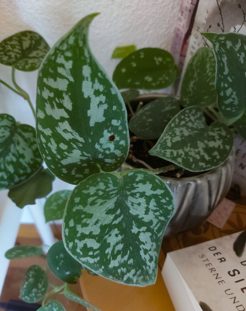 Ich liebe meine gefleckte Efeutute. Sie ist eine hängende Zimmerpflanze, die sehr pflegeleicht ist. Ich habe sie in einem Blumenladen entdeckt und musste sie sofort kaufen. Sie ist eher eine speziellere Pflanze, nicht wegen der Pflege, sondern weil sie ein wunderschönes Merkmal besitzt. Sie glitzert, wenn die Sonnenstrahlen auf ihre Blätter scheinen. Die Blätter besitzen nämlich weiße Flecken, die gewisse Partikel beinhalten, die den Glanz auf der weißen Oberfläche erzeugen.