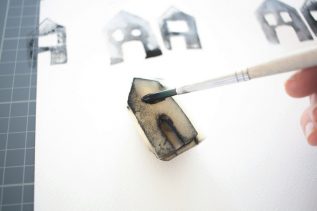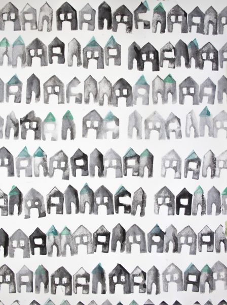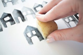 Hier sieht man einen klassischen Kartoffeldruck mit verschiedenen Hausmotiven, die Dächer sind z. T. durch einen weiteren türkisfarbenen Stempel hervorgehoben und setzen dadurch farbige Akzente.