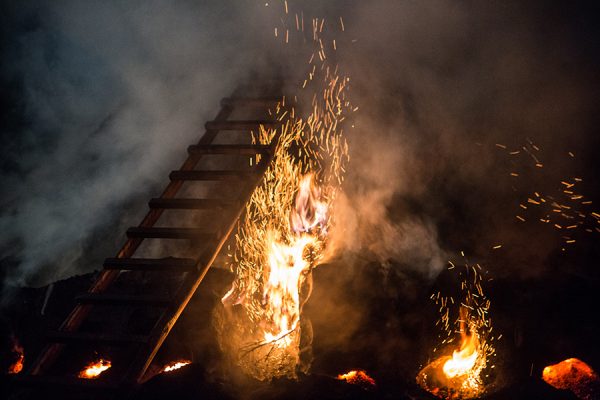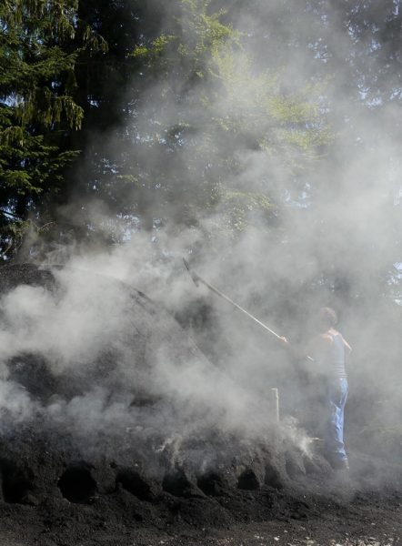 Der Landwirt und Köhler bei der Herstellung von Holzkohle im Kohlemeiler auf der Pilgeregg im Entlebuch. Das Foto entstand anlässlich der Dreharbeiten zum Dokumentarfilm «Köhlernächte» von Robert Müller. © Simon Meyer