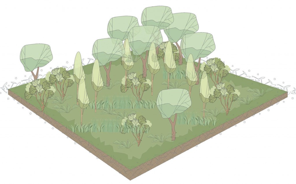 Ein Waldgarten in den gemäßigten Breiten besteht also nicht aus sieben oder mehr Etagen, sondern ist aufgebaut aus den drei Schichten Baumschicht, Strauchschicht, Krautschicht und ähnelt nicht ganz einem Wald, wie wir ihn kennen, sondern viel mehr einem «Stretch-Wald», damit die ausreichende Lichtversorgung zwischen den Gehölzen gewährleistet werden kann.