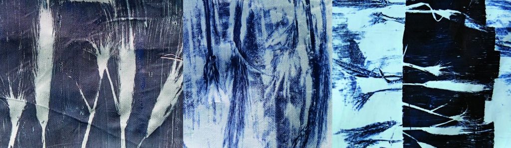 Die Gelliplatte wird eingewalzt; je dicker wir die Farbe auftragen, desto stärker wird nachher der Kontrast zu den weißen Flächen. Dann legen wir Pflanzenteile auf der Platte zurecht. Würden wir sie andrücken und wieder abnehmen, hätten wir sie als Stempel verwendet. Für den Schablonendruck lassen wir sie aber auf der Platte liegen und legen das zu bedruckende Material darüber und reiben es gut ab. Wir haben hier ährenförmige Gräser verwendet, die leicht erhöht waren. Dann muss man zusehen, dass man um die Ähren herum gut anreibt. Die Farbe sollte bei dieser Technik noch gut feucht sein.
