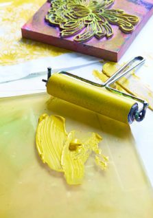 Beim Verwenden der Gelliplatte ist es dasselbe Prinzip: Mit diversen Materialien oder Haushaltsgegenständen kann die auf der Gelliplatte aufgetragene Farbe getupft, gestempelt, mit Textur oder Mustern versehen werden; dann erst kommt das Blatt Papier oder ein anderes Trägermaterial (z.B. Stoff) zum Einsatz. Es wird nur noch auf die Gelliplatte gelegt, mit der Hand oder der Rückseite eines Löffels abgerieben – und wir haben einen Monodruck, also einen einmaligen Druck in der Hand. Das geht kinderleicht; ist also für Farbbegeisterte jeden Alters bestens geeignet.