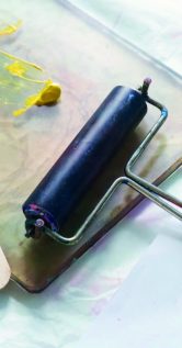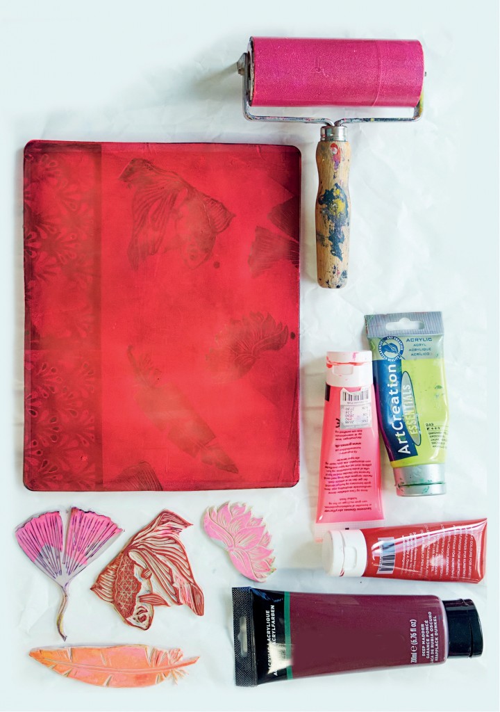 • diverse gestalterische Werkzeuge und Materialien wie eine Linolwalze, Stempel, Pinsel etc.