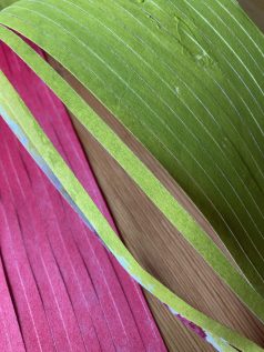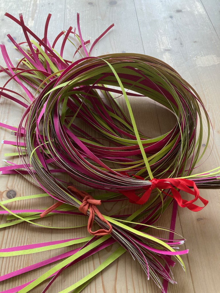 Meine Papierbänder waren 9-10 cm breit und die verwendete Walze der Nudelmaschine ergab Flechtstreifen von 7mm Breite.