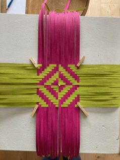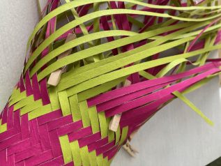 Mit der linken Hand fasse ich in diese Elemente und beobachte, welches der aufgebogenen Elemente als erstes durch die Elemente in der linken Hand geflochten werden soll – es ist das erste rechterhand in den aufgebogenen Gruppe, auf dem Foto bei mir ist es pinkfarbig (aufgebogen, die nun nach unten weisende Seite ist grün).