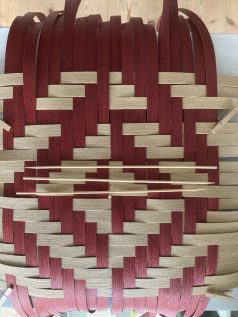 Dass für ein unterbruchfreies Weiterlaufen des Köpermusters an den Korbwänden ein Kunstgriff nötig ist, weiß ich eigentlich seit Jahren; habe das auch schon öfters abgezählt und aufgezeichnet, aber tatsächlich noch nie in der Praxis gemacht – entsprechend gespannt begann ich, die Anleitung zu befolgen.