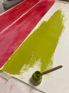 In Ermangelung einer Farbwalze benutzte ich einen Pinsel. Das Ergebnis wurde etwas fleckig, was aber später an den einzelnen Streifen nicht mehr störend war.