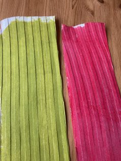 - Packpapier 90 g/m² geht gut, es sind aber, bedingt durch das geringe Papiergewicht, ziemlich fragile Streifen.