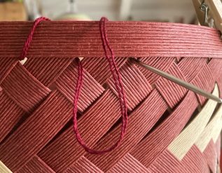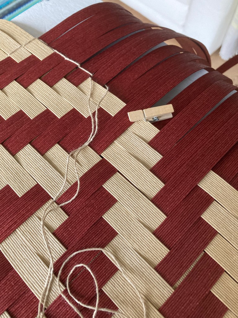 Da ich mich nicht an die Bildung von Ecken wagen wollte, ohne diese Fläche zu stabilisieren (nur vier Klammern wie bei der Autorin wären mir zu wenig) fügte ich eine Runde Zwirnbindung (S. 66-67 in meinem Buch «Aus Streifen geflochten») aus Perlgarn um die geflochtene Fläche. Jetzt konnte ich ohne das fertige Geflecht aus der Ordnung zu bringen, alle Elemente rundum auf die gleiche Länge bringen und die Arbeit problemlos von der Fläche in die Hand aufnehmen – bereit zum Flechten der vier Korbecken.