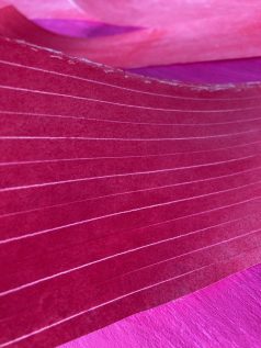- Handgeschöpftes Papier (meine Beispiele aus Indien und Laos, Papiergewicht nicht bekannt) gehen besser als erwartet, neigen aber zum «Verrumpfen» (ähnlich wie Stoff) und Schiefziehen auf der Walze. Außerdem bleiben die Streifen leicht zusammengehängt, wie beim Aquarellpapier meines ersten Versuches. Das Streifentrennen geht aber recht gut.