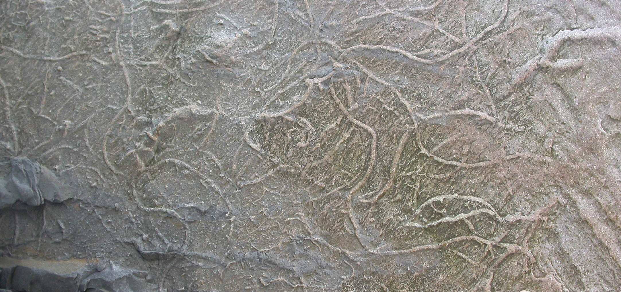 Versteinerte Pfade: Spuren von Würmern und anderen Tieren, die auf einem alten Meeresboden umherkrochen und ‑krabbelten – bis heute als Sandsteinschicht erhalten. ©Jan Zalasiewicz