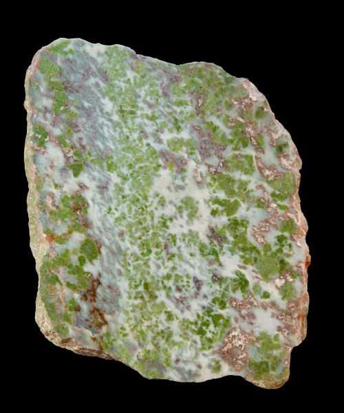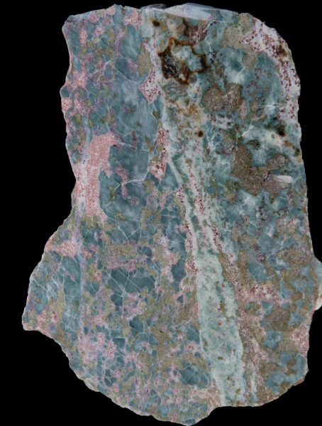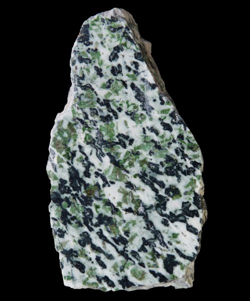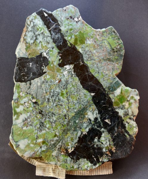 - Ein komplexes Stück in Eklogitfazies, mit granatreichen Olivin-Pseudomorphosen und in der Mitte einer Kluftfüllung aus Omphacit und Zoisit.