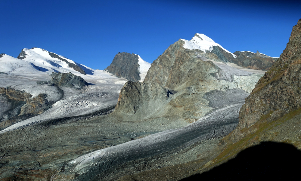 Rechts das Allalinhorn mit dem vergleichsweise hellen Allalin-Gabbro.
