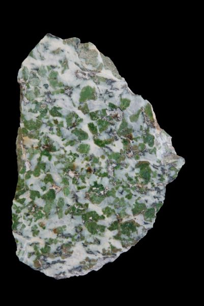 Der bekannteste Typus, ein Normalgabbro (kaum Olivin-Pseudomorphosen) mit froschgrünen Chrom-Omphacit-Pseudomorphosen nach Augit und weißlich dichtem Saussurit 2 (Plagioklas- Pseudo morphosen)