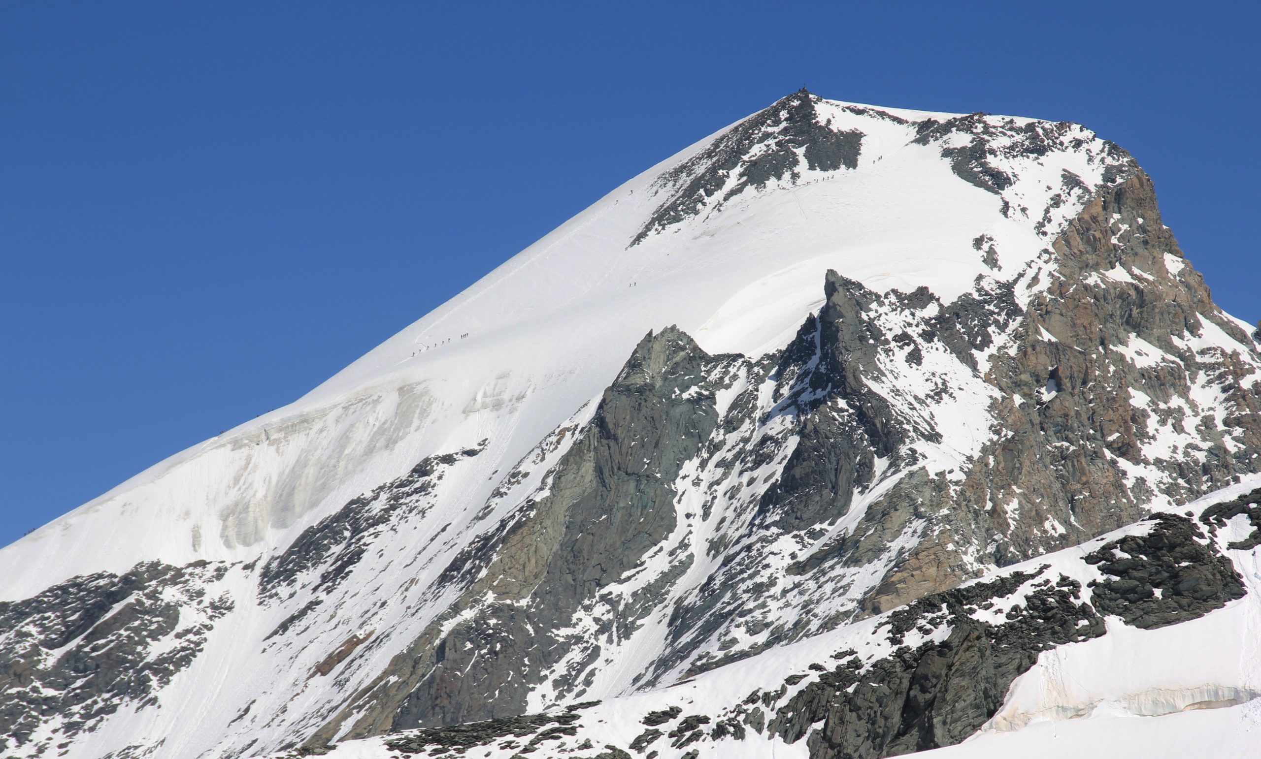 Das Allalinhorn von SSW, vom Aufstieg vom Rimpfischhorn gesehen. Die Grenze zwischen dem braun anwitternden Allalin-Gabbro rechts und den steil darüberliegenden dunkel grüngrauen Metabasalten ist klar zu erkennen, ebenso eine kleine eingschuppte Gabbro-Linse links der Bildmitte.