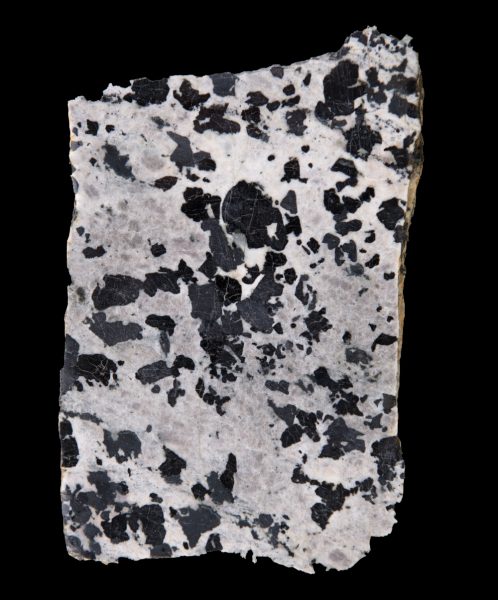 - Das gleiche Gestein wie der Normalgabbro – aber nicht Eklogitfazies metamorph, sondern mit weitestgehend erhaltenem magmatischem Mineralbestand. Schwarz = Augit, die helle Masse ist ehemaliger Plagioklas. Die hellbräunlichen Partien sind noch erhaltener Plagioklas, die weisse Masse ist zu Saussurit 1 umgewandelt.