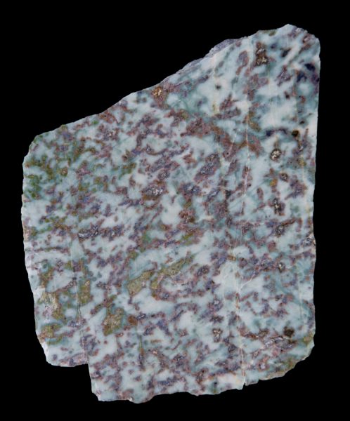 - Ein fast trokolithischer Gabbro (magmatisch fast nur Plagioklas–Olivin) in Eklogitfazies. Hier liegen die Olivin-Pseudomorphosen als Glaukophan (+/–Talk) -Häufchen mit roten Granatsäumen vor. Der weisse Saussurit 2 ist um die Olivin-Pseudomorphosen grünlichblau verfärbt, was auf höhere Anteile an Glaukophan und Omphacit neben dem weissen Zoisit zurückzuführen ist.