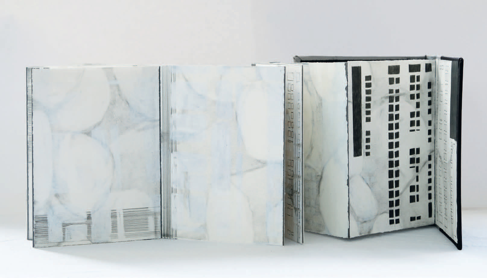 Durch Herausschneiden einiger Rechtecke entstand je Ausdruck eine Schablone, die sie wiederum auf verschiedene Papierqualitäten übertrug. Erneut als Vorlage zum Ausschneiden genutzt, entstanden so die einzelnen Seiten für das Leporello. Durch die sich überlagernden Blätter ergeben sich abwechslungsreiche, variantenreiche Durchblicke. Legen sich immer mehr Lagen übereinander, bis zur Verdichtung, geht die Leichtigkeit über zum Undurchdringlichen.