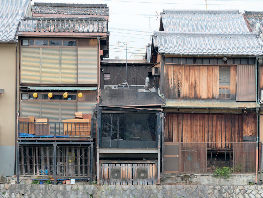 Inspiriert von der grafischen Struktur der Machiya-Häuser in Kyoto, die sich entlang des Kamo-Flusses reihen, fertigte die Autorin dieses Leporello. Sie ging folgendermaßen vor: Ihre dort entstandenen Fotos druckte sie auf einem glatten, weißen Papier von 190 g/m2 aus. Die Machiya-Häuser mit den dahinterliegenden Silhouetten moderner Gebäude haben bereits eine sehr grafische Anmutung, die sich zur Entwicklung abstrakter Formen anbietet.