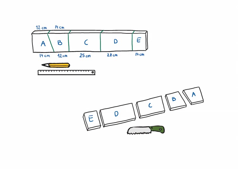 - 1 Brett (gerne ein Schwartenbrett*), das Brett im Beispiel war 2,3 × 12 × 93 cm dick, breit und lang.