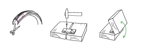 Als Scharnier für den Deckel dient ein Stück Fahrradmantel. Dafür kann mit der Schere ein etwa 3 cm langes und 2 cm breites Stück seitlich aus einem ausgedienten Fahrradmantel geschnitten werden. Achte darauf, diesen mit der Innenseite nach oben auf Deckel und Rückwand zu schrauben. Sonst klemmt sich das Eichhörnchen die Pfoten ein, weil der Deckel von selbst zuschnappt.