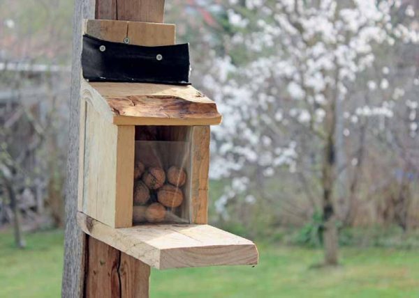 Im folgenden Beispiel zeigen wir euch, wie man ganz einfach aus einem einzelnen Brett ein mit Nüssen gefülltes Eichhörnchenfutterhaus baut: