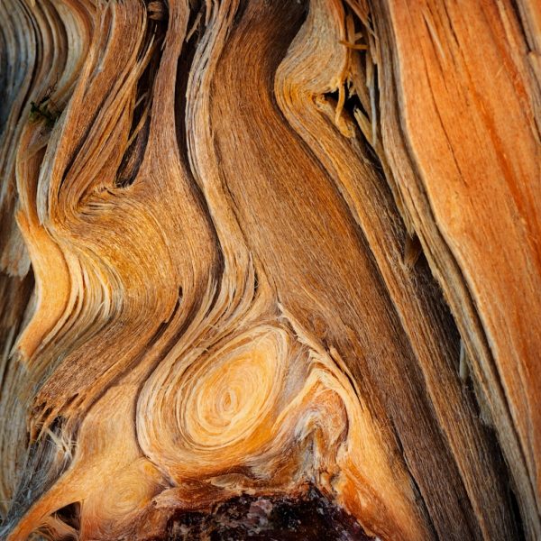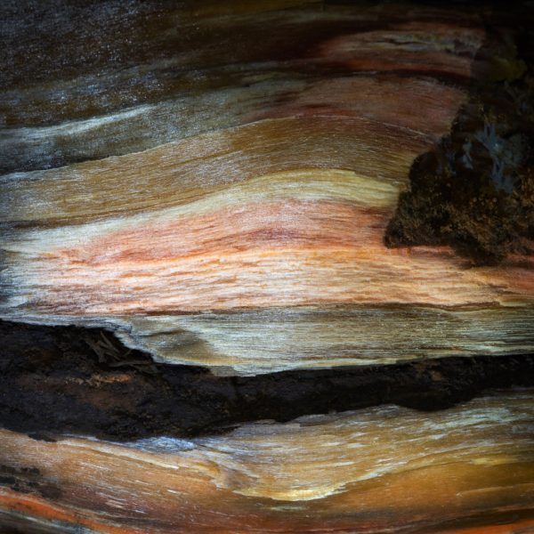 Der schwarz-braune, halb vermoderte Koloss auf «meinem» Strand erfreute mich zuerst keineswegs. Mit seinen elf Metern Länge und über einem Meter Durchmesser nahm er ganz schön viel Platz in Anspruch, und hübsch anzusehen war er auch nicht. Da ich aber Brennholz für mein abendliches Lagerfeuer brauchte, begann ich, ihn mit Handwerkzeugen aufzutun und Holz aus ihm herauszubrechen. Dabei eröffnete sich mir ein faszinierendes Kaleidoskop von ganz unterschiedlichen Farben und Formen, Texturen und Gerüchen. Die Oberfläche war komplett morsch, sodass ich das Moderholz von bloßer Hand abschälen und zerbröseln konnte. Mit ein paar Axthieben drang ich ins Innere ein, wo das Holz noch frisch war, wie wenn es gestern noch gelebt hätte. Es war voll duftendem Harz. Dazwischen zeigten sich Spuren aller Phasen der Zersetzung; gelbe und rötliche Verfärbungen waren da zu erkennen, grünliche Streifen entlang der Jahrringe, braune Flecken und schwarze Linien, die zum Teil skurrile Formen hatten. Je tiefer ich in den Stamm eindrang, desto verblüffendere Dinge entdeckte ich. Erst jetzt griff ich zur Kamera. Mit dem Stemmeisen brach ich Stück um Stück vom Baumstamm ab und suchte nach interessanten Stellen. Meine Fundstücke positionierte ich so, dass der Einfallswinkel des Tageslichts eine optimale Inszenierung gestattete, und ich wartete die Zeit ab, bis auch die Lichttemperatur stimmte für das Bild, das ich machen wollte. So gelang mir schon im Sommer 2021 eine ganze Reihe von Bildern, die mich begeisterten. Ich nahm mir vor, diese in meiner nächsten Ausstellung zu zeigen oder sie in einem Buch zu veröffentlichen.