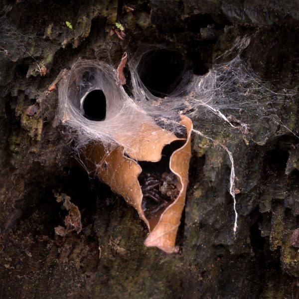 Totholz ist Lebensraum für unzählige Gliederfüsser. Kein Wunder, dass eine Trichterspinne hier ihr Netz installiert hat. Signal- und Stolperfäden informieren die lauernde Spinne, wenn sich ein Beutetier ihrer trichterförmigen Wohnhöhle nähert. Trichterspinnen verbringen den grössten Teil ihres Lebens in ihrem Versteck und verlassen es nur gelegentlich, um Beute zu fangen oder um einen neuen Platz zu suchen – zum Beispiel, wenn sie zu wenig Nahrung haben.