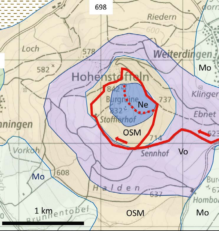 Abbildung 4-4 Vereinfachte geologische Karte des Vulkans Hohenstoffeln und Wegbeschreibung der Exkursion (rote Punktlinie, Karte: © swisstopo). Mo: glaziale Moräne, Ne: Nephelinit, Säulenbasalt, OSM: Obere Süsswassermolasse, Vo: Vulkanische Gesteine, Deckenbasalt (Karten: © swisstopo, umgezeichnet).