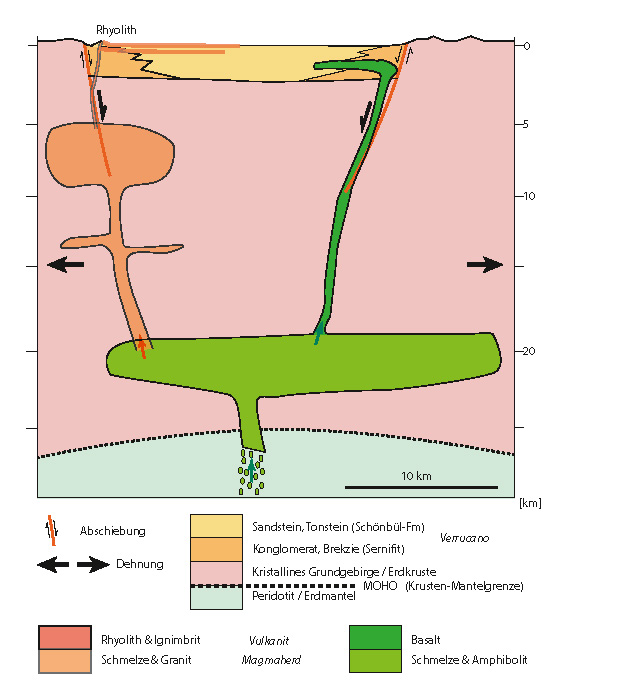 Schematischer Schnitt durch einen Vulkan, der mit einem Kontinentalgraben (einem «Rift») verbunden ist (modifiziert nach Pfiffner 2024).