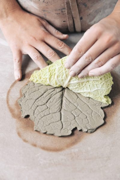 Das raffinierte Behältnis wird ganz konventionell aus einer Tonplatte hergestellt. Für dieses Projekt sind Blätter von allen möglichen Pflanzen geeignet. Mein persönlicher Favorit ist Wirsing. Die unglaublich feine Aderung übertragt sich perfekt auf den Ton. Haltet aber auch nach anderen interessanten Blättern Ausschau! Diese können sowohl in der Küche als auch im eigenen Garten oder auf einem Spaziergang in der Natur gefunden werden. Besonders jetzt in der Herbstzeit sollte das kein Problem sein.