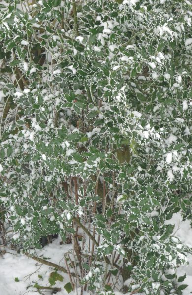 Zu einem «schönen» Garten im Winter gehören unbedingt Immergrüne Bäume und Sträucher, allen voran die Stechpalme. Auch die oft geschmähten Nadelgehölze bereichern den Garten im Winter mit ihrer schönen Gestalt. Aber da gilt die Kunst der Beschränkung! Nicht durcheinander pflanzen, und schon gar keine Zwergkoniferen, sondern einzelne Solitäre, die sich im Gartenraum voll entfalten dürfen. Unter den Gehölzen und auf Freiflächen machen sich Flächendecker, die im Winter belaubt sind, gut. Mein Favorit ist das Kleine Immergrün für beschattete Standorte. Bei mir bedeckt es eine große Fläche unter Haselnusssträuchern. Es setzt sogar sehr bald und sehr spät im Jahr herrlich blaue Blüten an.