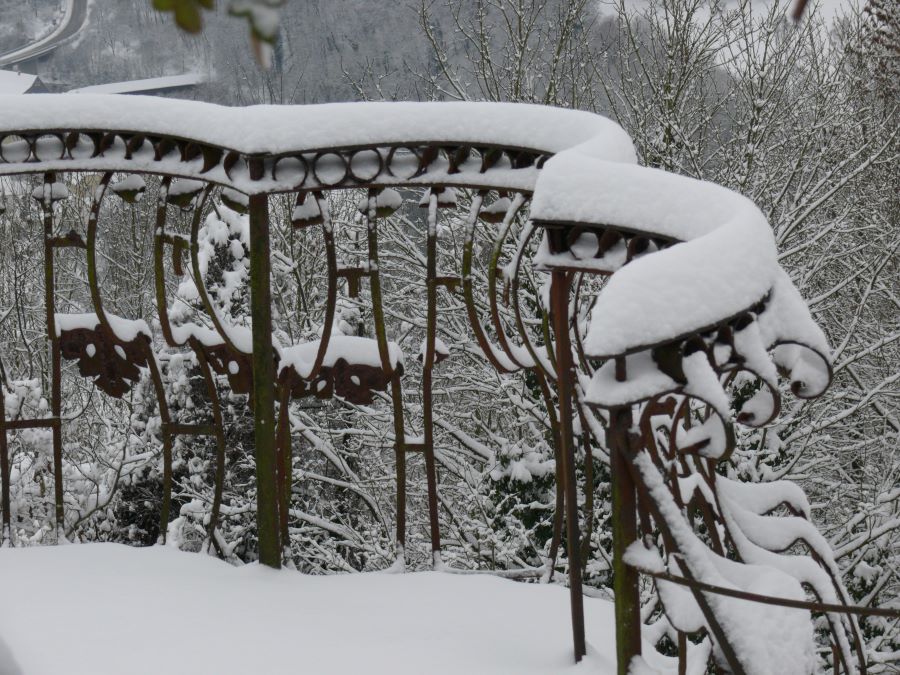 Für den winterlichen Garten ist eine architektonische Grundstruktur wichtig. Mit einer linienhaften Formschnitthecke lässt sich das leicht verwirklichen, entweder zur Abgrenzung oder im inneren Gartenraum zur Untergliederung. Zum derzeit problematischen Buchsbaum bieten sich Hainbuche oder Liguster als Alternativen an. Reif und Schnee zaubern aus dem Ast- und Blattwerk der Gehölze kleine Meisterwerke, wie Zuckerbäckerei.