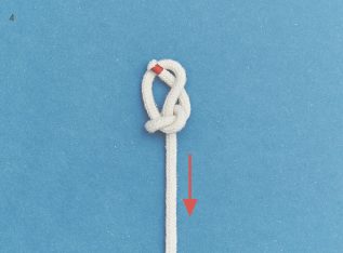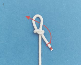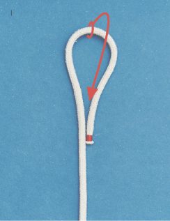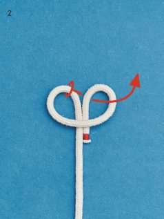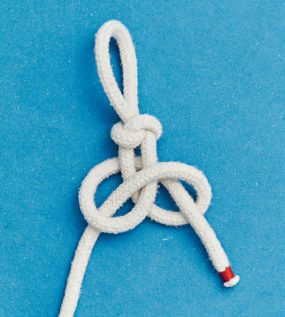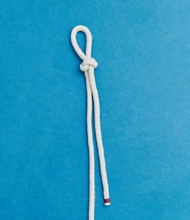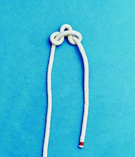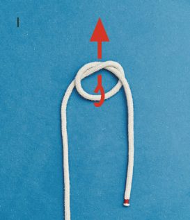 BILD 1 und 2: Schlage einen Überhandknoten. Achte darauf, in welche Richtung du ihn bindest. Die untere Bucht durch den Überhandknoten ziehen.