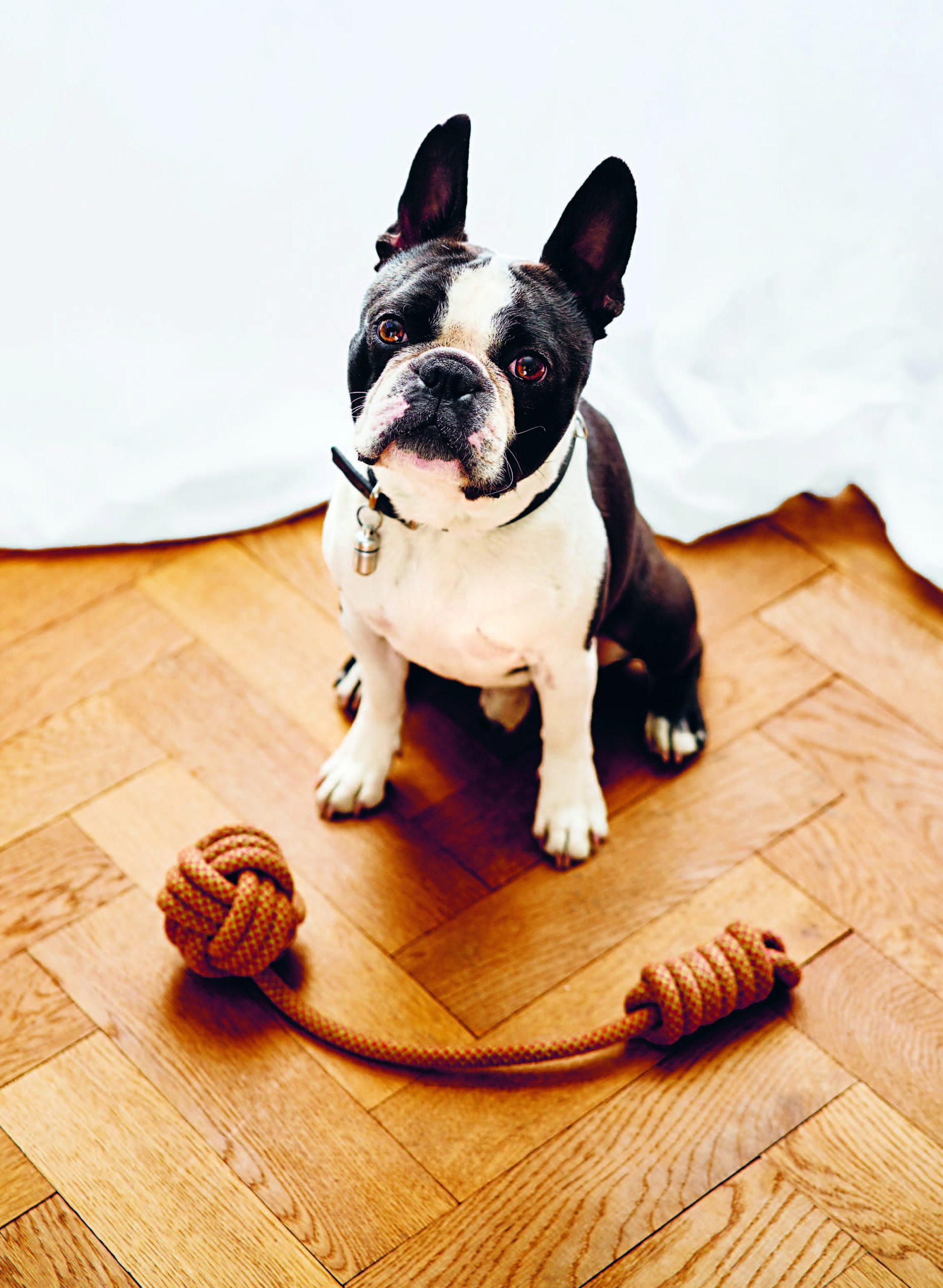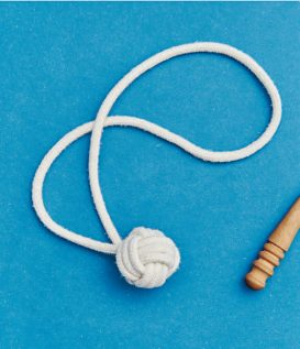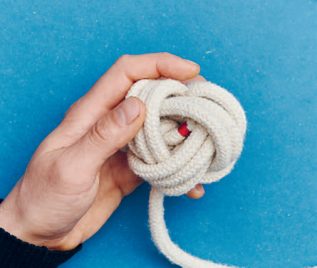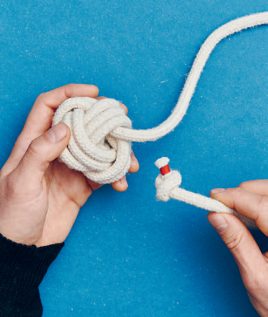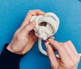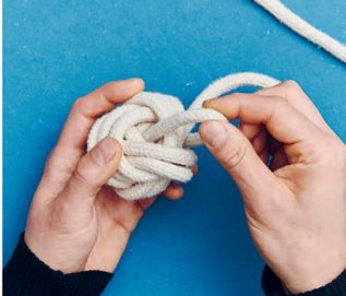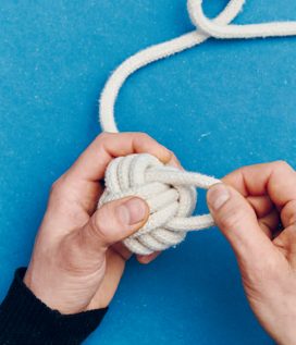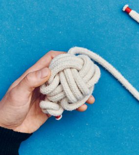 Ein selbstgemachtes Hundespielzeug ist ideal, wenn du deinen Hund richtig auspowern willst. Dank der klassischen Affenfaust ist es nicht aufwendig, einen solchen „Ball mit Schnur“ herzustellen. Der Knoten ist dekorativ und eignet sich auch gut für Schlüsselringe oder sonstige Sachen, bei denen du einen Anhänger mit ordentlich Volumen brauchst. Dabei sind sowohl die Affenfaust als auch der Handgriff aus Wurfleinenknoten (dieser wird auf S. 82 im Buch näher vorgestellt) dienlich, um ein Seil an den Enden zu beschweren. Du kannst es in jedem Fall weit werfen. Du kannst die Affenfaust auch mit einer Schlaufe gestalten und den Handgriff weglassen. In der Affenfaust steckt noch ein unsichtbarer Stopper knoten, der auch nützlich sein kann: der Ashley-Stopperknoten.