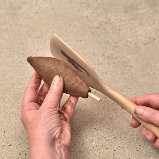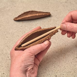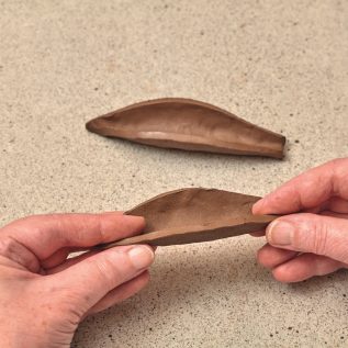 2 Die Blätter zwischen Daumen und Fingern zu einer Bootform mit erhöhten Seiten verbiegen. Alle Kanten an beiden Teilen aufrauen (z.B. mit einem Messer) und einschlickern (mit verdünnter Tonmasse bestreichen), bevor sie zu einem Hohlkörper verbunden werden.