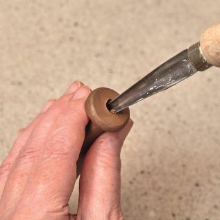 8 Mittig durch das Tonplättchen mit dem Lochschneider eine Öffnung eindrehen. Sie muss bis in den hohlen Innenraum des Griffs reichen und im Durchmesser groß genug für den Stiel des später eingepassten Teesiebes oder sonstigen Besteckteils sein. Bitte etwas Spielraum einrechnen, da die Öffnung sich beim Brennen und Trocknen um ein paar Prozent verkleinert.