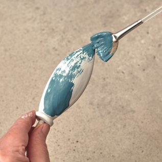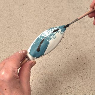 4 Das Zufallsmuster durch eine kräftige Linie in einer dritten Glasurfarbe vervollständigen. Diese wird mit einem feineren Pinsel aufgetragen. Den Rohling nach dem Trocknen im vorgesehenen Temperaturbereich brennen. Und fertig sind die persönlichen Besteckgriffe!