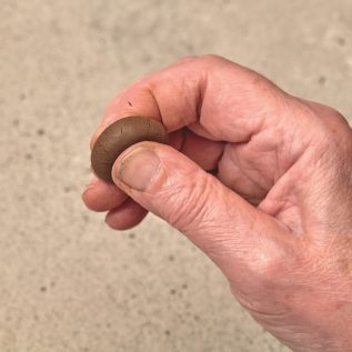 6 Aus einem Tonrest zwischen den Handflächen eine kleine Kugel rollen, zu einem Plättchen mit etwa 5 mm Stärke abflachen.