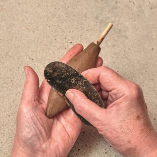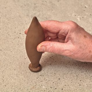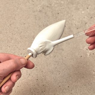 7 Das Holzstäbchen aus dem Inneren ziehen. Das vorgeformte Tonplättchen ans offene Griffende angarnieren, nachdem zuvor alle Verbindungsflächen aufgeraut und eingeschlickert wurden. Die Naht rundum mit einem feinen weichen Tonwürstchen verstärken. Tonreste gleichmäßig verstreichen.
