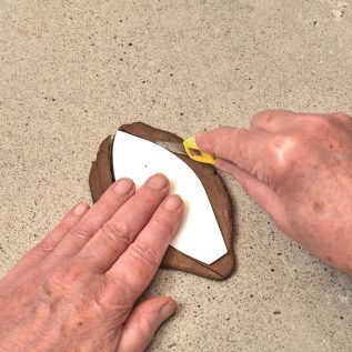 1 Der vorgesehenen Form entsprechend eine Schablone zuschneiden. Ich habe hier eine Blattform gewählt (4 cm breit, 10 cm lang). Aus knapp 50 g Ton kann eine ca. 5 mm dicke Tonplatte ausgewallt werden (wie ein Kuchenteig). Es ist wichtig, dass der Ton nicht zu dick ausgewallt wird, da er ab einer zu hohen Dicke beim Brennvorgang explodieren kann.
