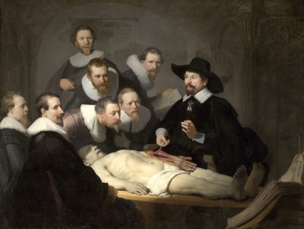 Die Anatomiestunde des Dr. Nicolaes Tulp (1632). Rembrandts Gemälde zeigt den Amsterdamer Stadtanatomen Dr. Tulp. Er seziert die Leiche von Aris Kindt, der wegen bewaffneten Raubüberfalls gehängt worden war. ©Wikimedia Commons (Mauritshuis)