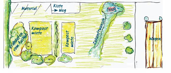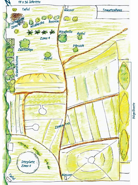 Der Sitzplatz entspricht der Zone 0. Der größte Teil des Gartens soll dem Gemüseanbau dienen.