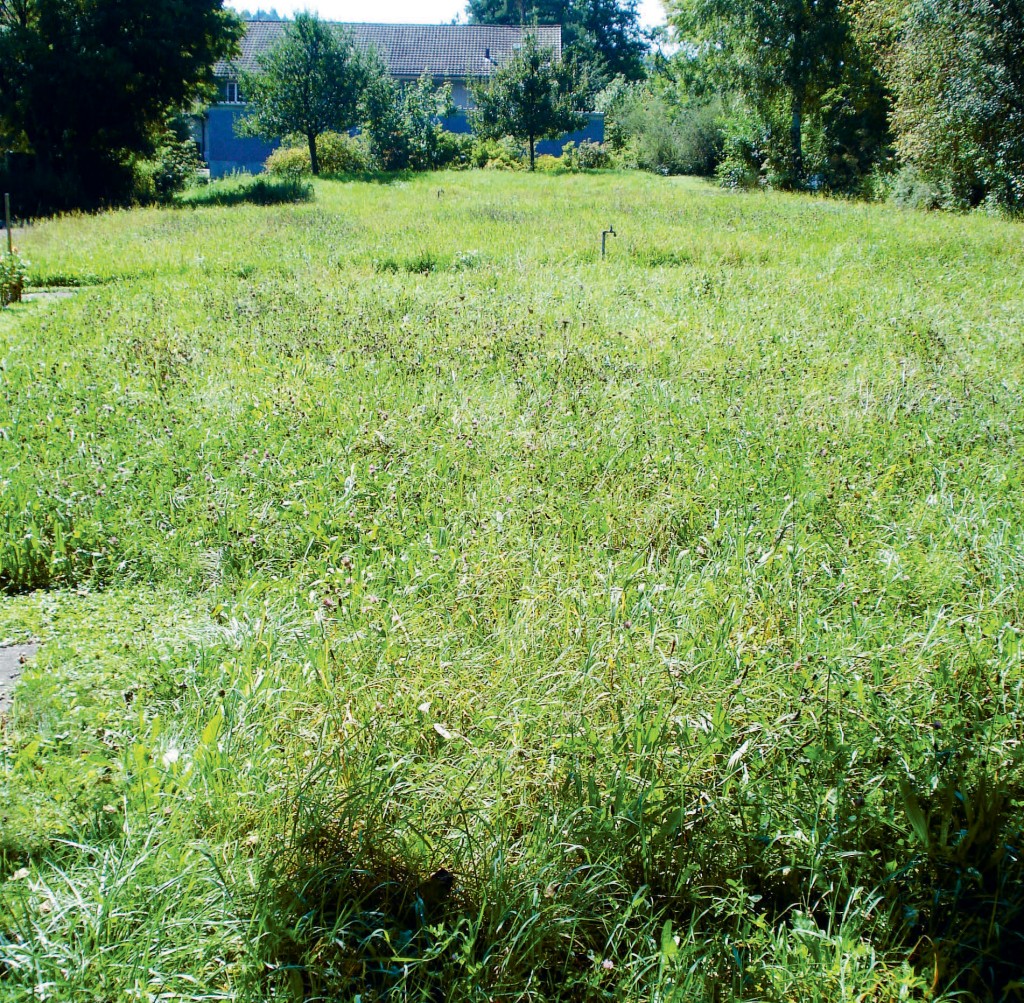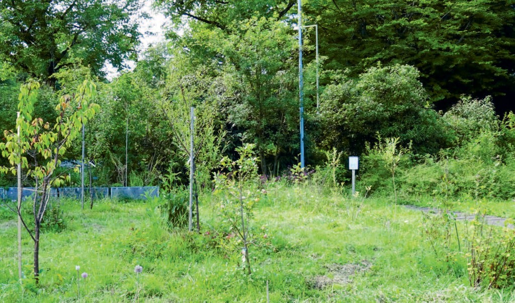 Ein Grundstück für den zukünftigen Gemeinschaftsgarten, Blick gegen Süden. Die Obstbäume im Hintergrund gehören zur Stadtgärtnerei. Wildkräuter im Garten geben Hinweise auf die Bodenqualität.