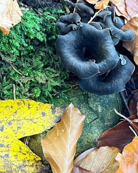 Ich kann mich noch genau an das aufgeregte Telefon mit meiner Mutter erinnern. Sie hatte soeben einen Platz im Wald gefunden, an dem sie Toten-Trompeten entdeckt hatte. Sie war unglaublich stolz, denn schon länger hatte sie nach dieser schwarzen trompetenförmigen Pilzart Ausschau gehalten. Auf einem Instagram-Kanal einer leidenschaftlichen Pilz-Coachin (Nadja Frotscher, @pilzcoachbadenweiler) wurde ihr Suchfieber erneut entflammt. Mit Hilfe der deutschen Pilzexpertin, die den Standort und Lieblingsplatz der Totentrompete so gut beschrieben hatte, machte sie sich auf die Socken und wurde in Massen fündig: Unter Rotbuchen auf kalkigen Böden, in Laubmischwäldern! Sie leben in Symbiose mit den Wurzeln der Buchen, manchmal auch mit Edelkastanie oder Eiche.